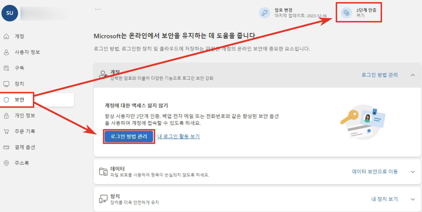 - 로그인 방법 관리 또는 2단계 인증 버튼을 클릭합니다.