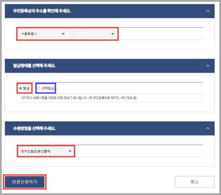 - 다양한 발급 옵션: 주소 변동 사항, 세대 구성 정보 등 추가 정보를 선택할 수 있습니다.