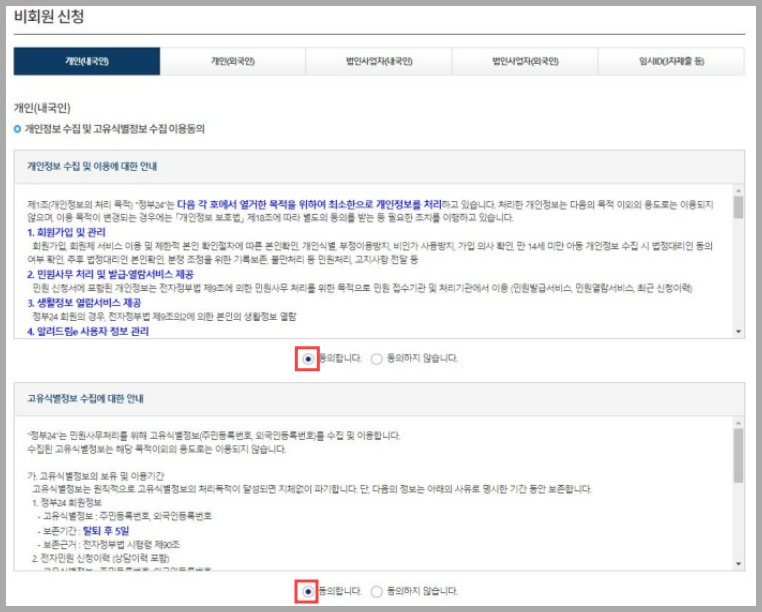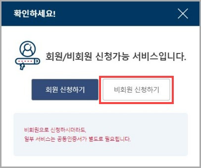 - 회원/비회원 선택: 회원 또는 비회원으로 신청이 가능합니다. 비회원 신청 시 이름, 주민등록번호, 입력확인만으로 신청할 수 있습니다.