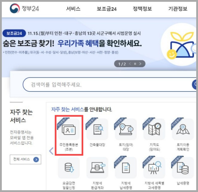 - 주민등록등본 메뉴 찾기: 메인 화면에서 "자주 찾는 서비스" 항목 중 주민등록등본(초본) 아이콘을 클릭합니다.