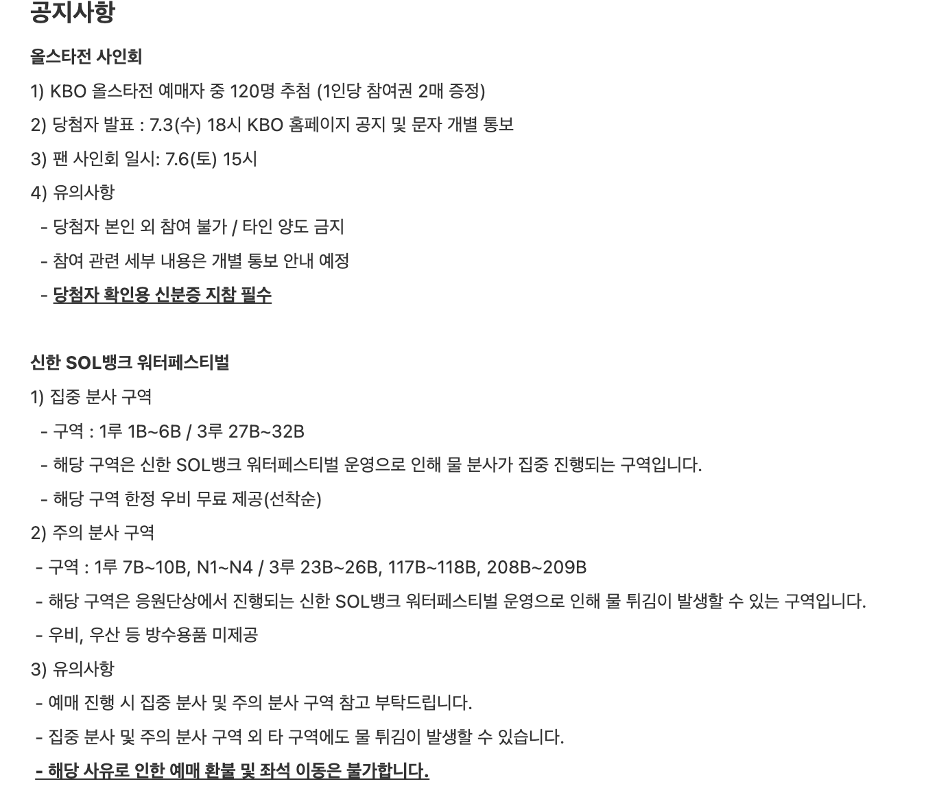 - KBO 올스타전 및 올스타 프라이데이는 모바일티켓으로만 운영됩니다. (일부 증빙이 필요한 티켓의 경우에만 확인 후 지류로 발권)